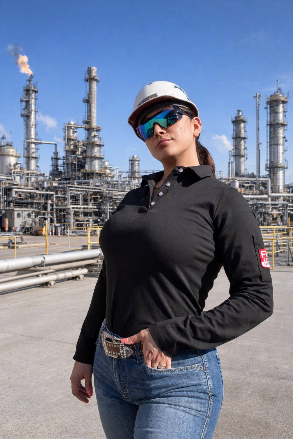 NFPA 2112–certified FR workwear tee built for real job sites. Made from 100% fire-retardant cotton with a stretchy, breathable feel that keeps you comfortable through long shifts. Features beautiful lavender button and side pen pockets for everyday utility. Designed for oil & gas, welding, electrical, and petroleum work—safety without sacrificing comfort.